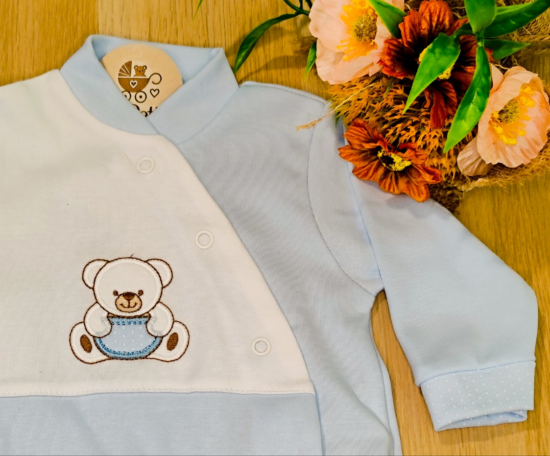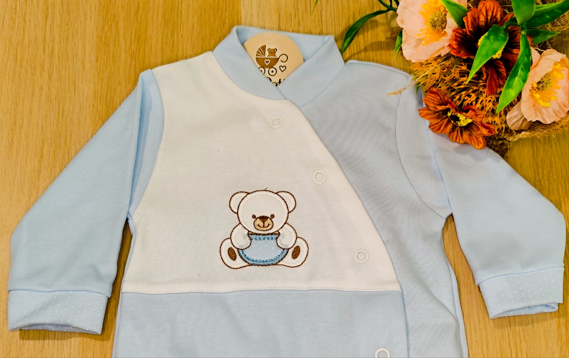 Este adorável babygrow é a escolha perfeita para momentos de ternura e conforto. Confeccionado em tecido suave e delicado 100% Algodão, é ideal para a pele sensível dos recém-nascidos. Apresenta um bonito tom de azul claro, com detalhe bordado de um ursinho.