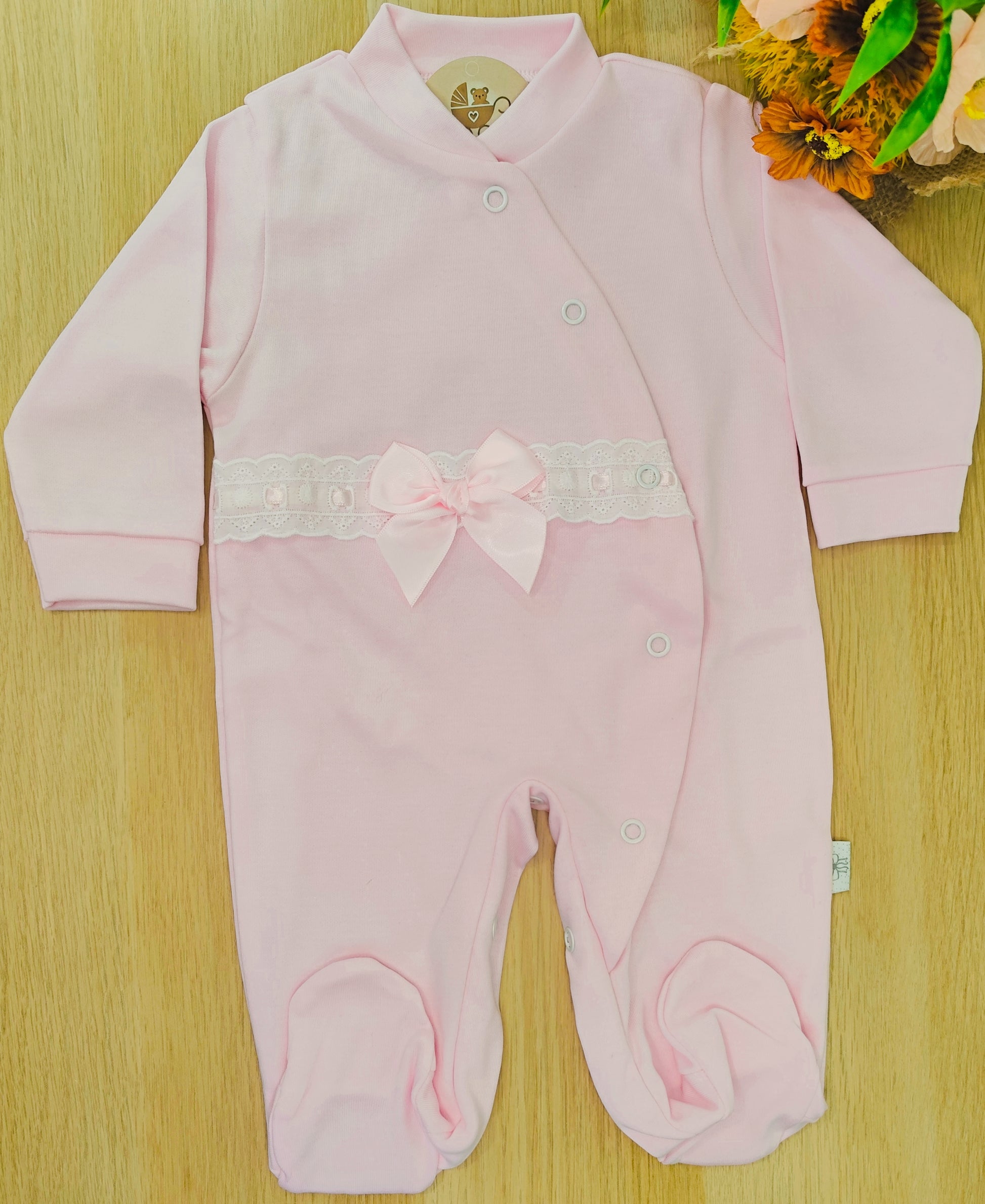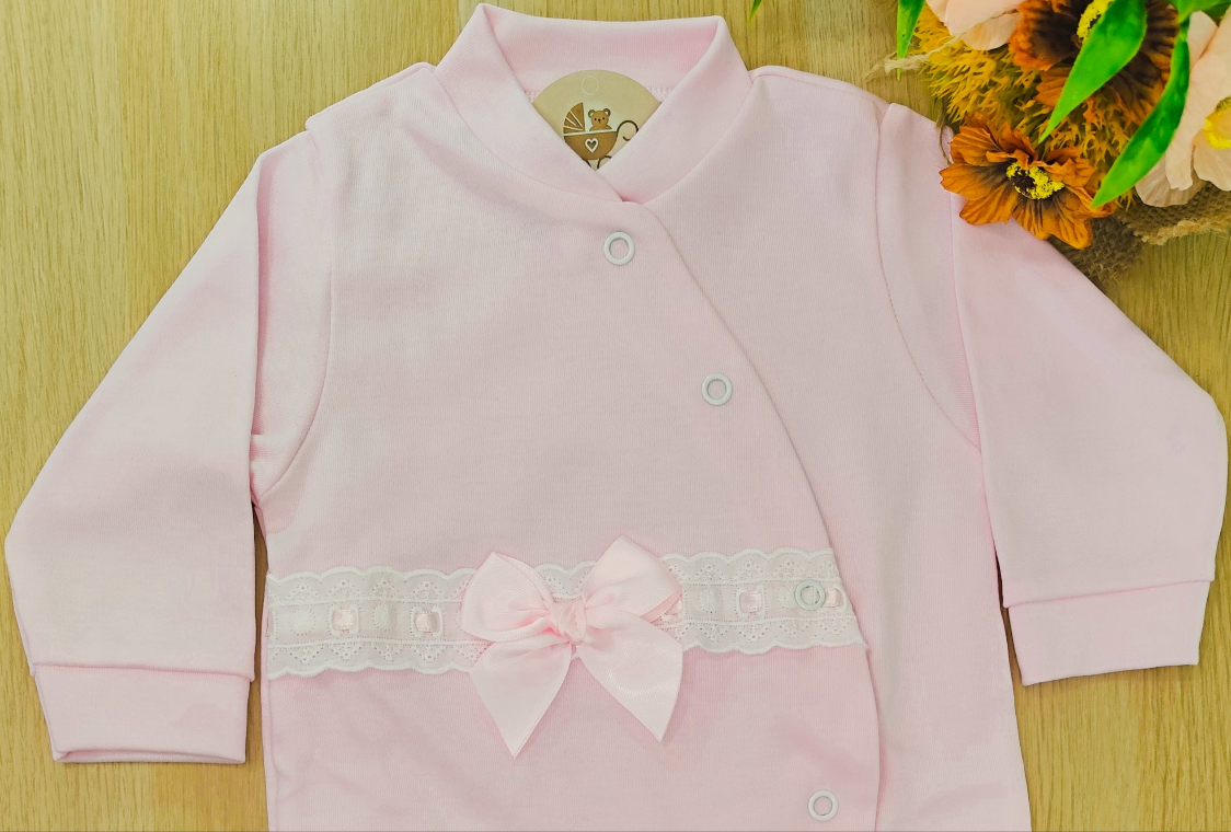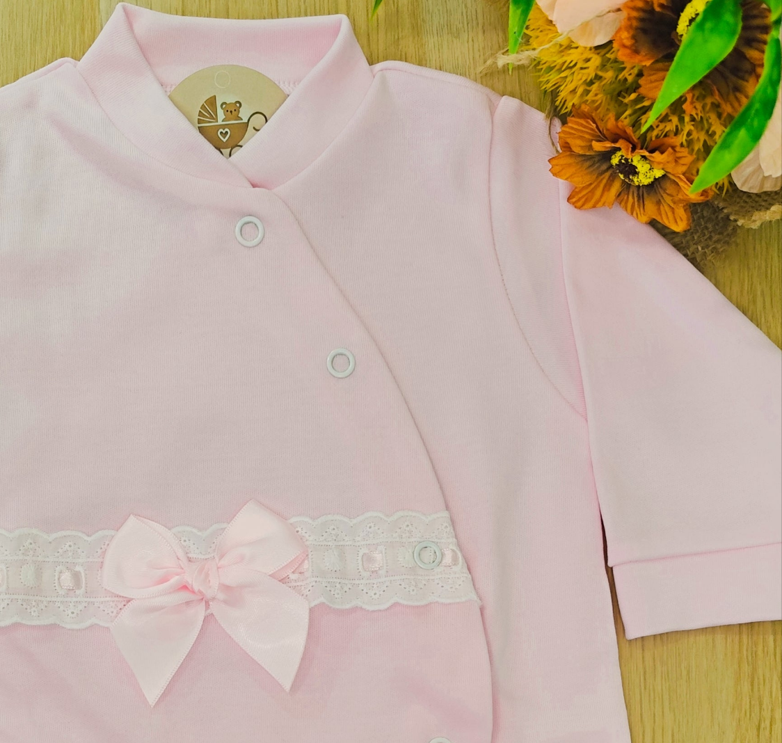Este adorável babygrow em 100% algodão rosa é perfeito para os primeiros dias do seu bebé. Com um delicado detalhe em renda e fita de cetim rosa com laço ao centro, combina conforto com um toque de elegância. O fecho com molas facilita a troca de roupa.