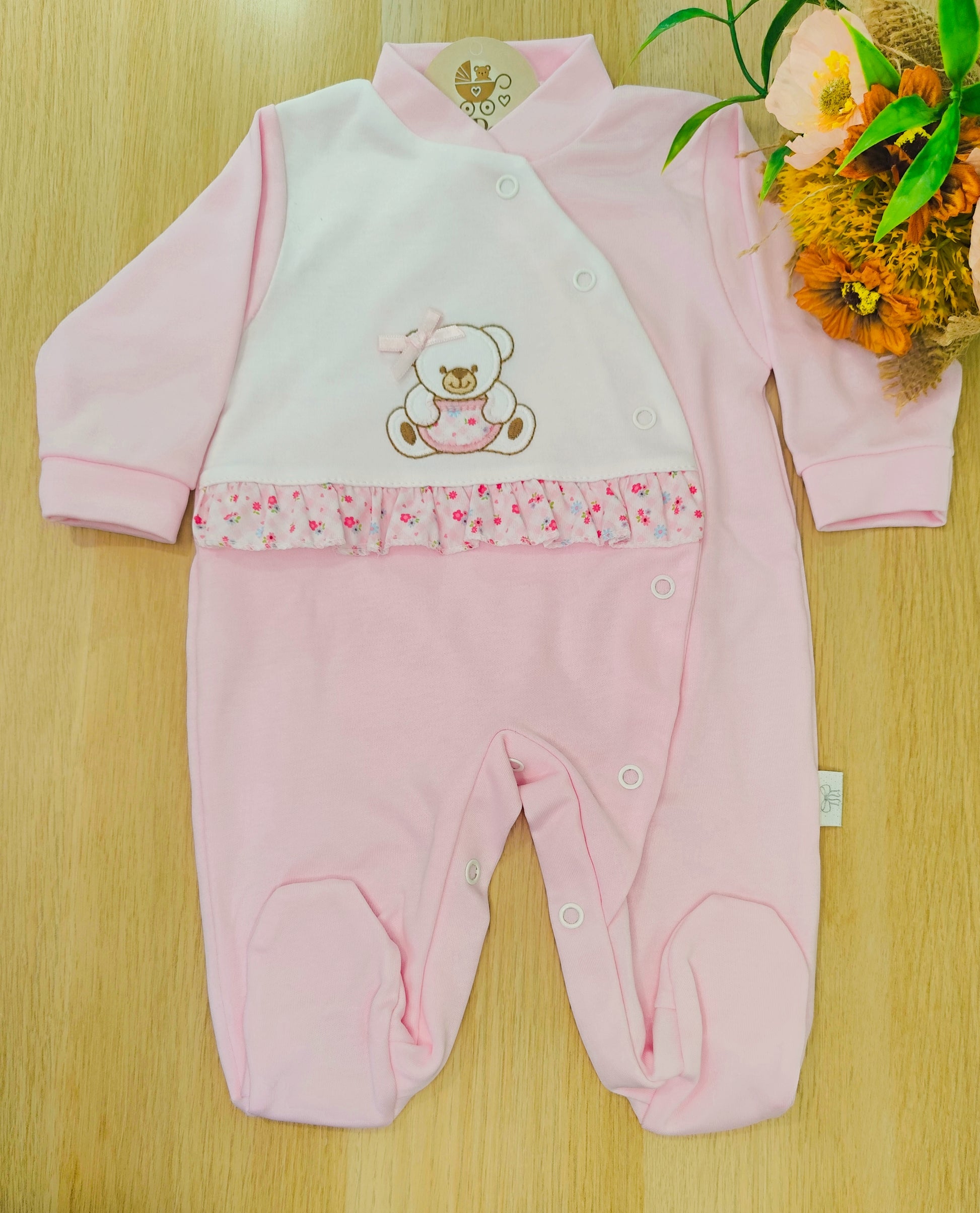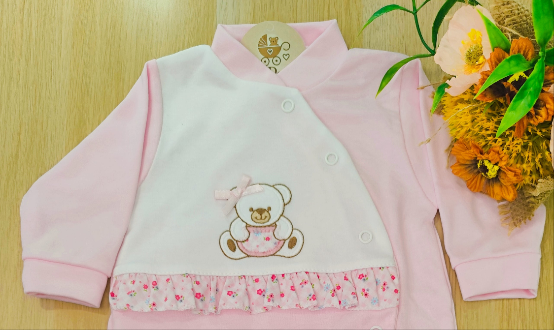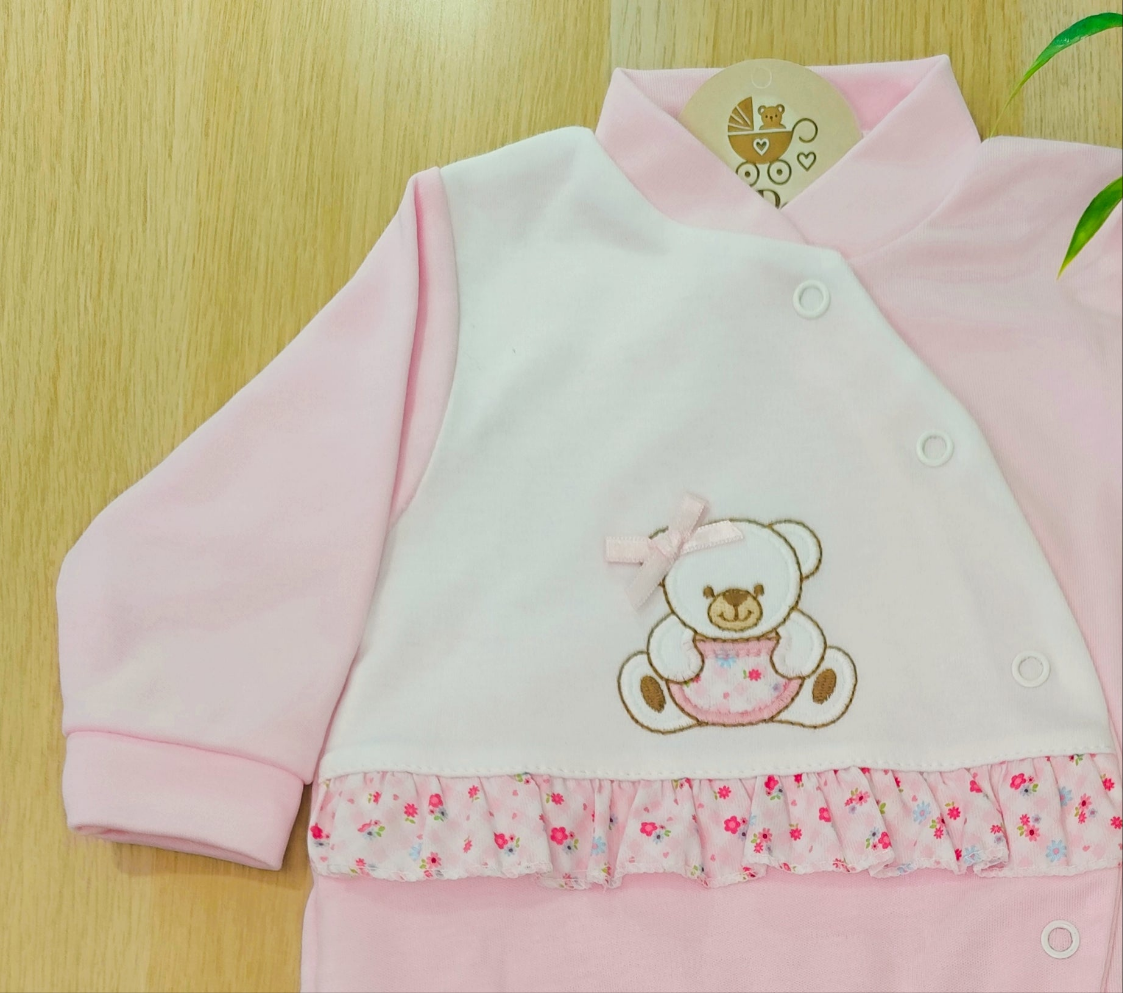 Este adorável babygrow para bebé menina é a escolha perfeita para momentos de ternura e conforto. Confeccionado em tecido suave e delicado 100% Algodão, é ideal para a pele sensível dos recém-nascidos. Apresenta um bonito tom de rosa claro, com detalhe bordado de uma ursinha com lacinho e um encantador folho com padrão floral na cintura.