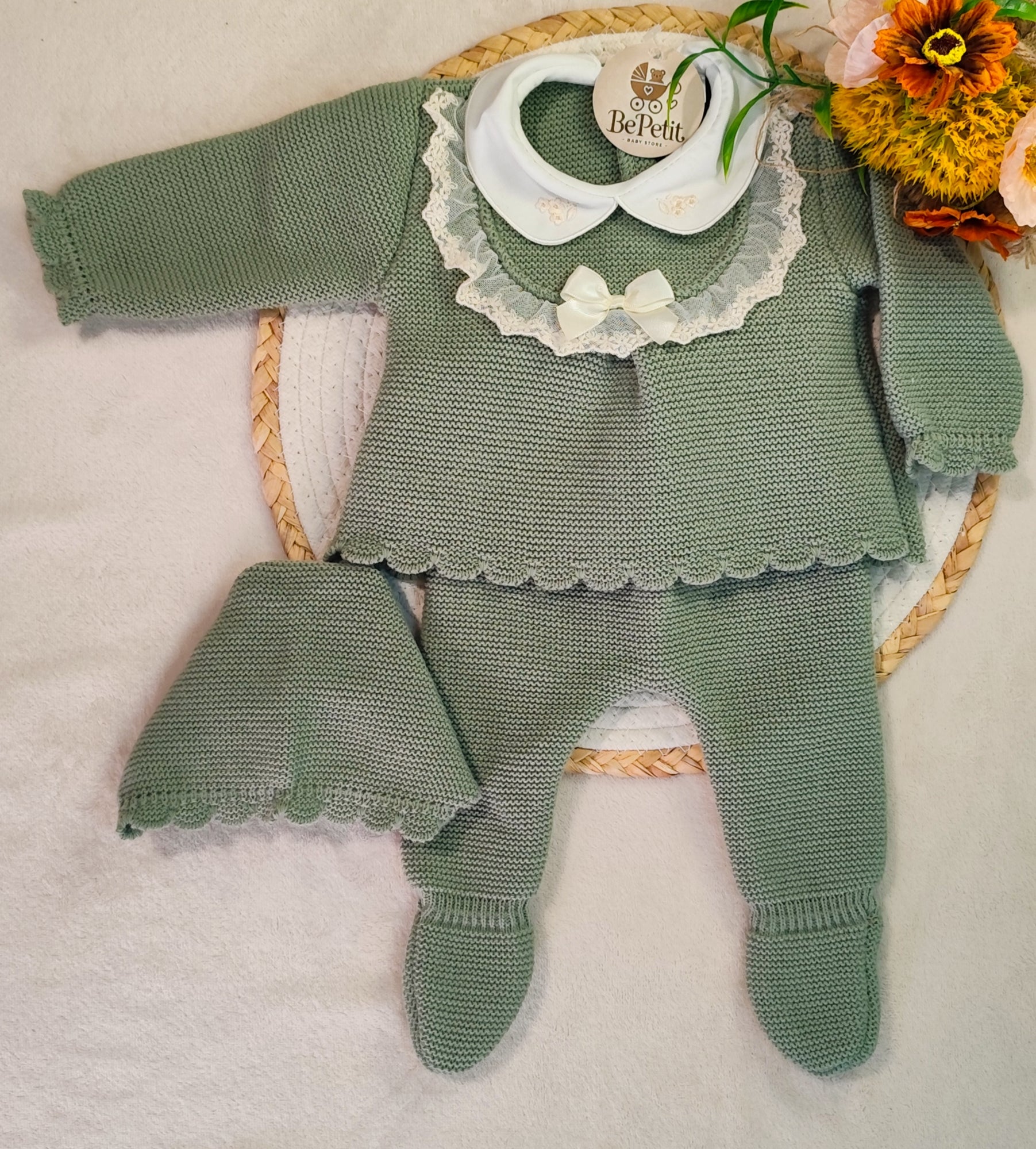 Conjunto malha 3 peças gola laço cetim