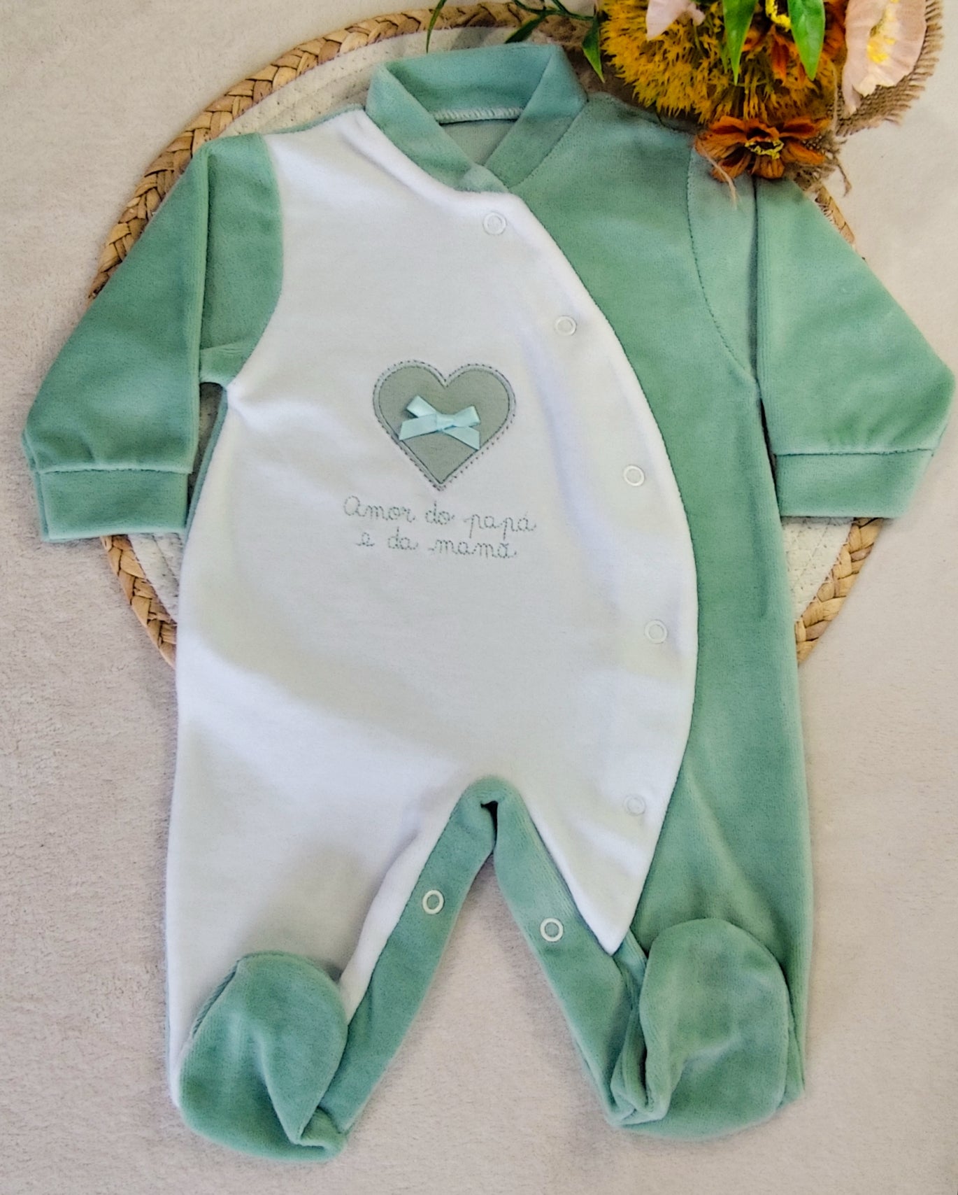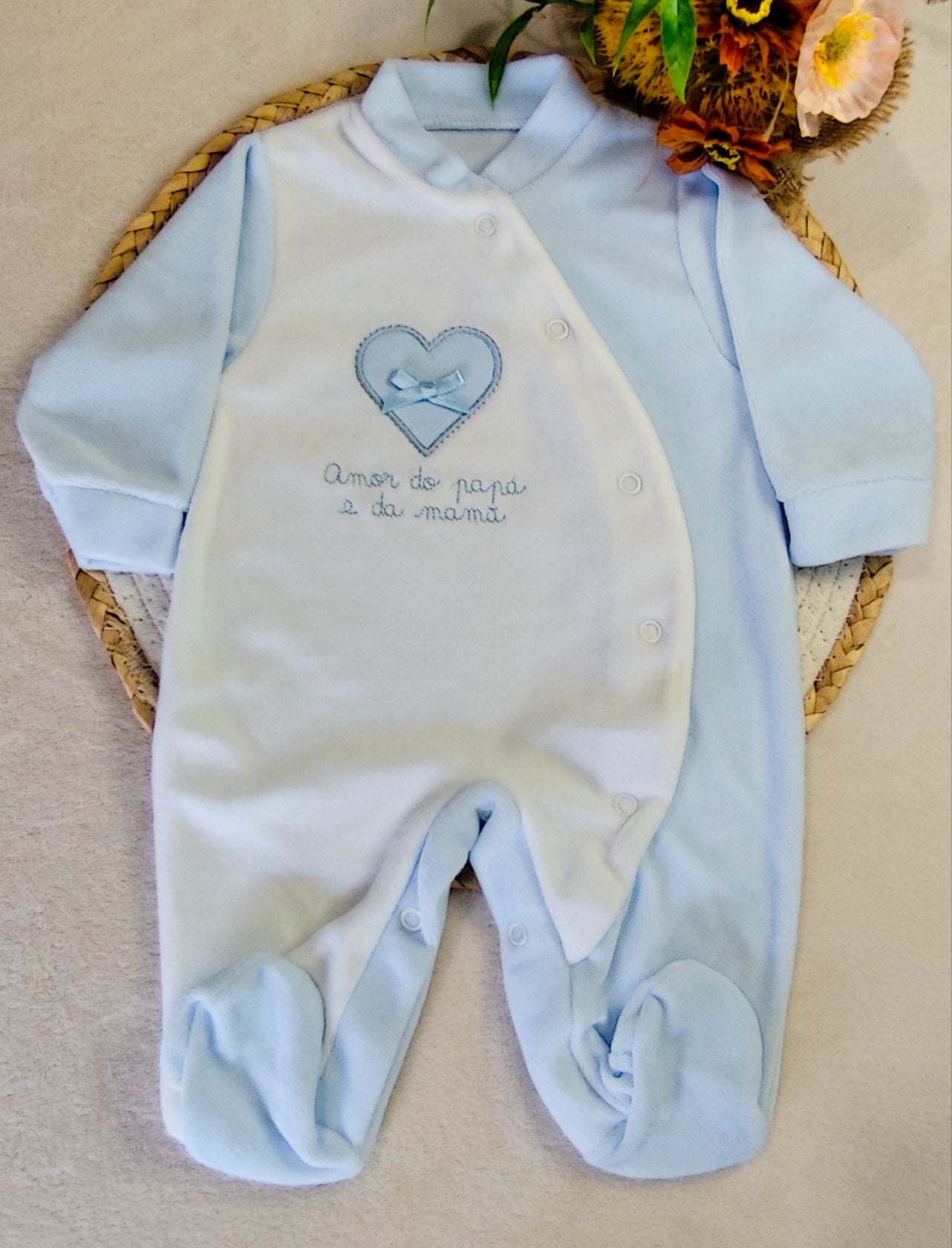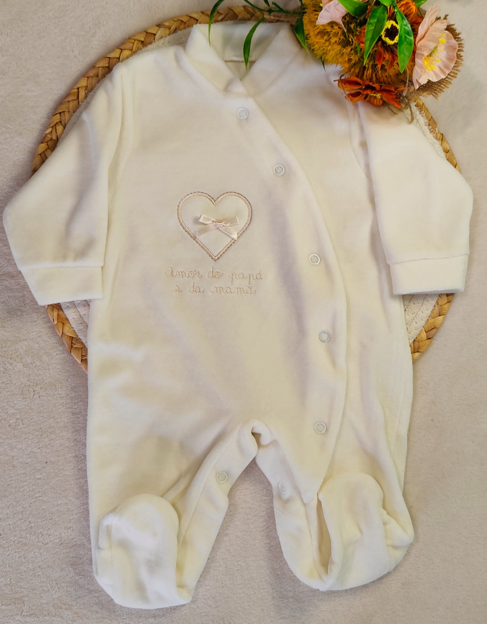 - Babygrow em veludo com fecho frontal e bordado decorativo