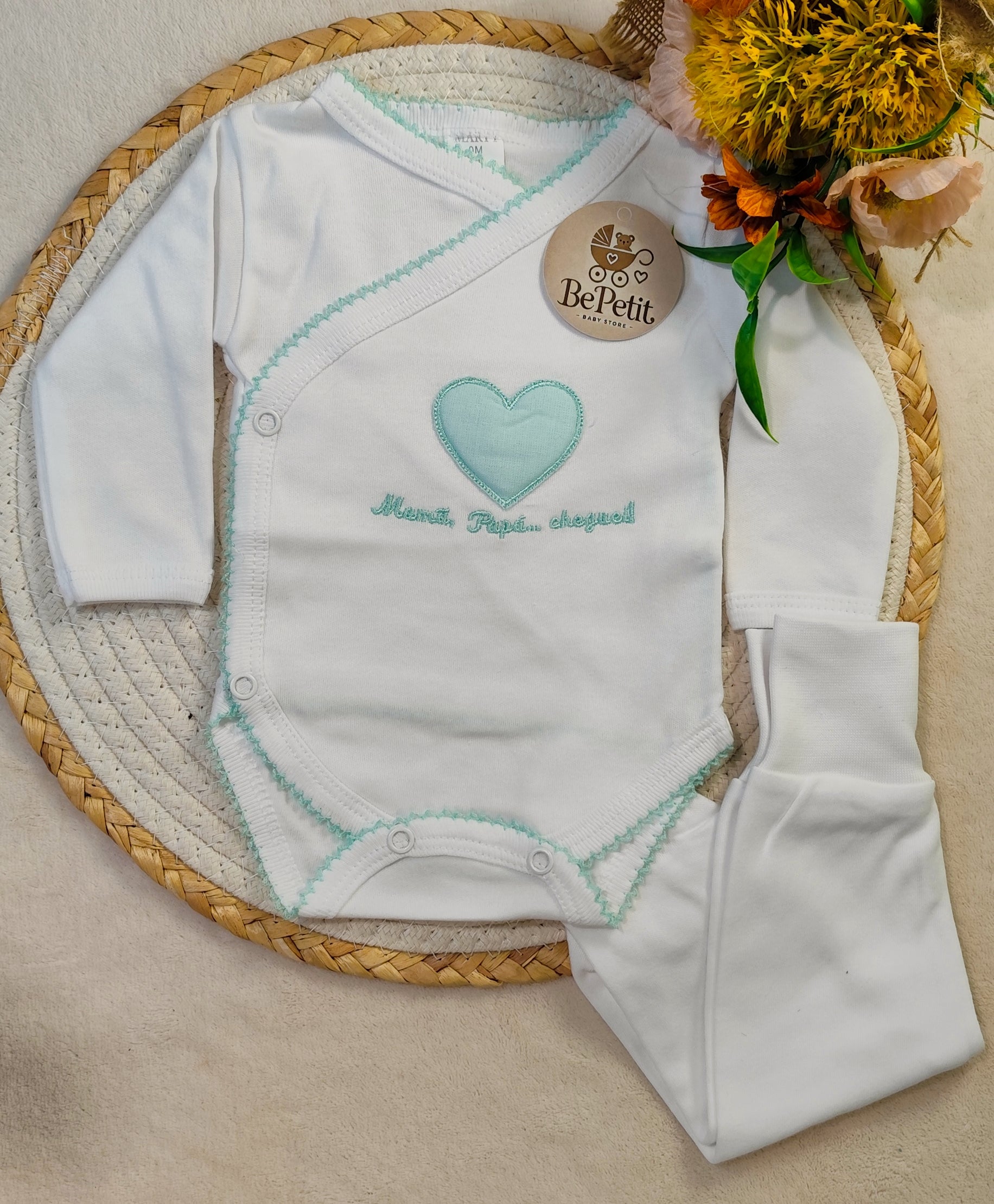 Conjunto de interiores em algodão macio com carda decorativa, ideal para aconchegar o bebé em casa ou dormir.