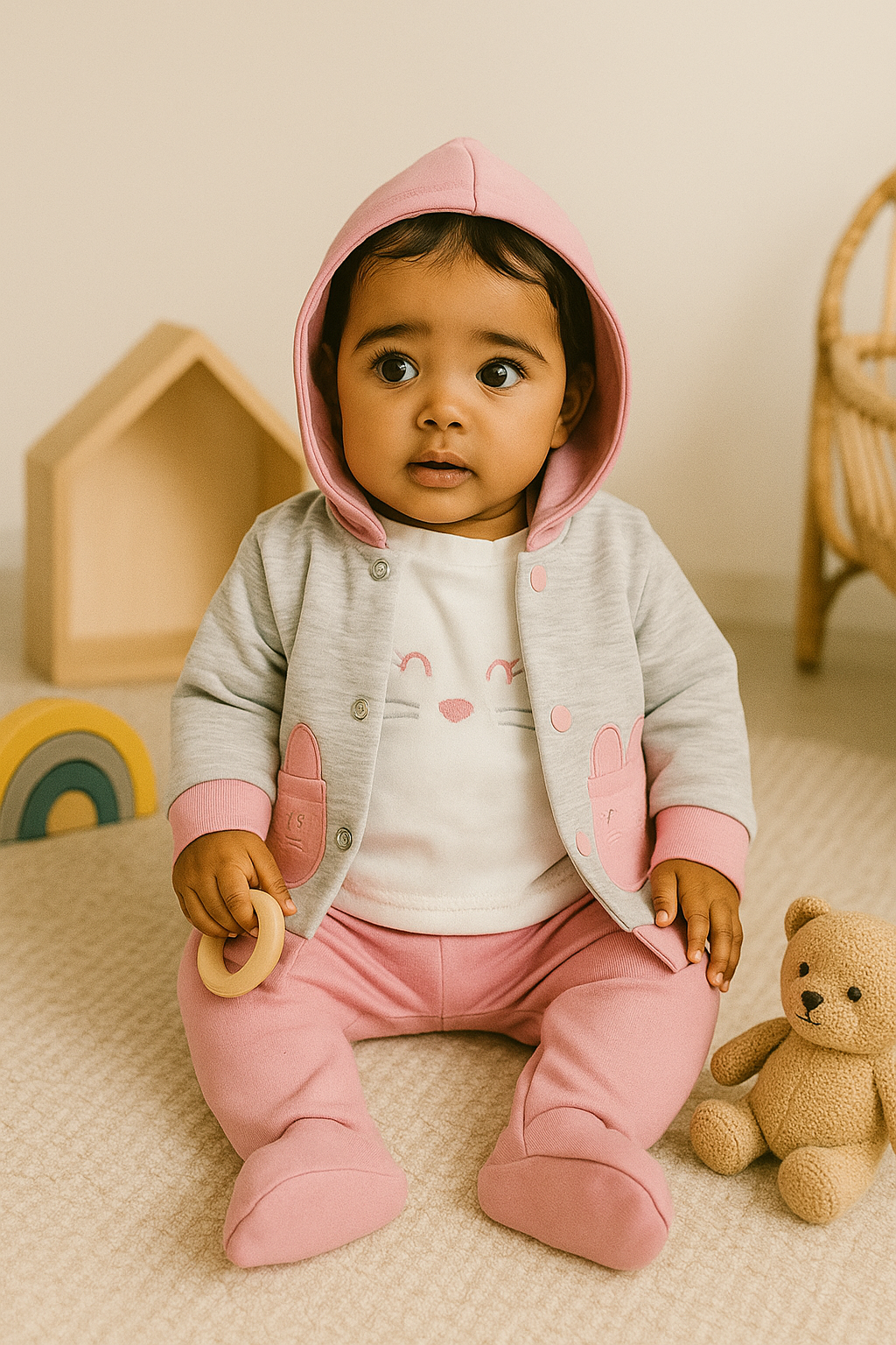 O conjunto perfeito para o seu bebé: três peças em algodão suave. Cores delicadas e design encantador para momentos especiais.