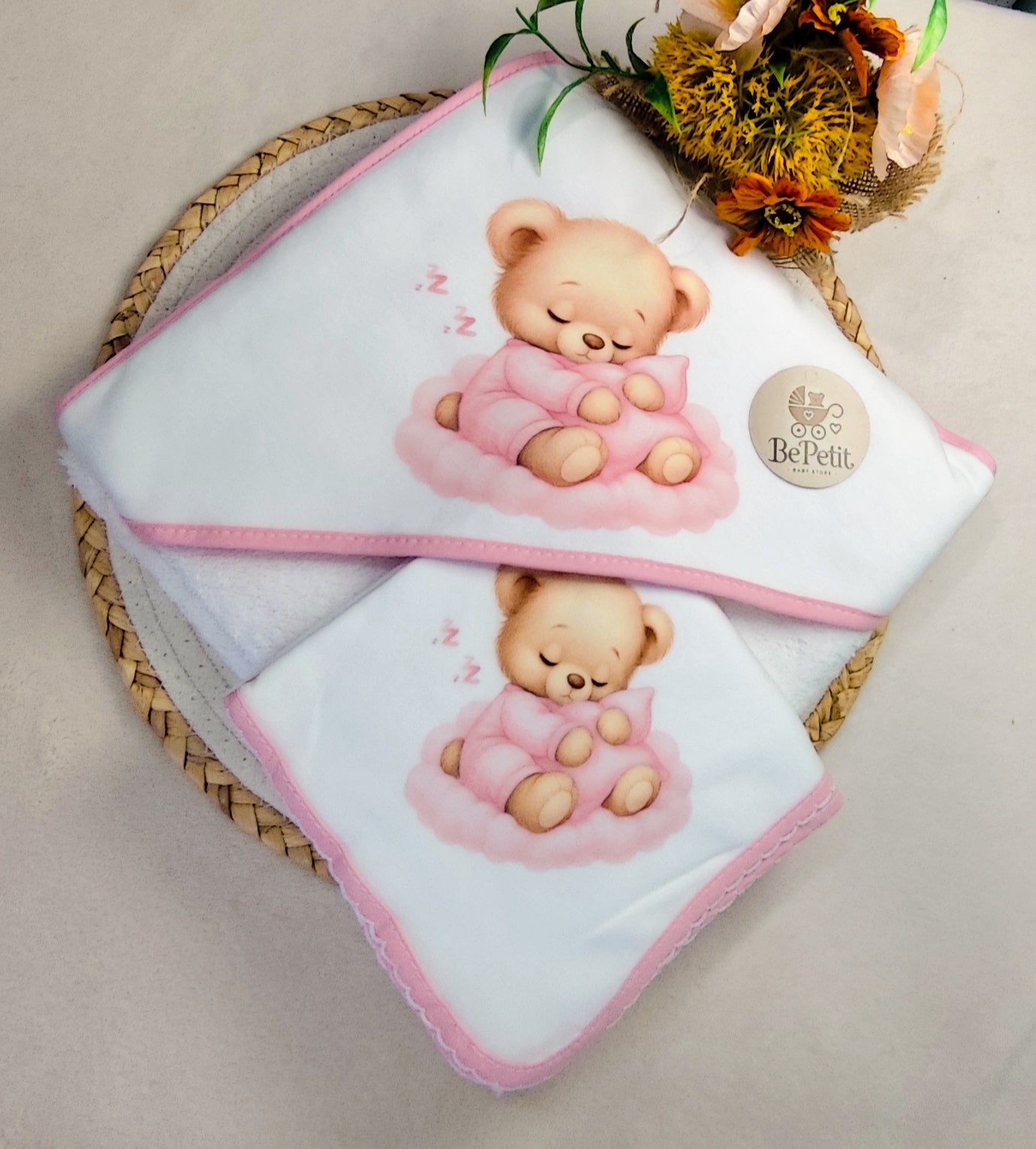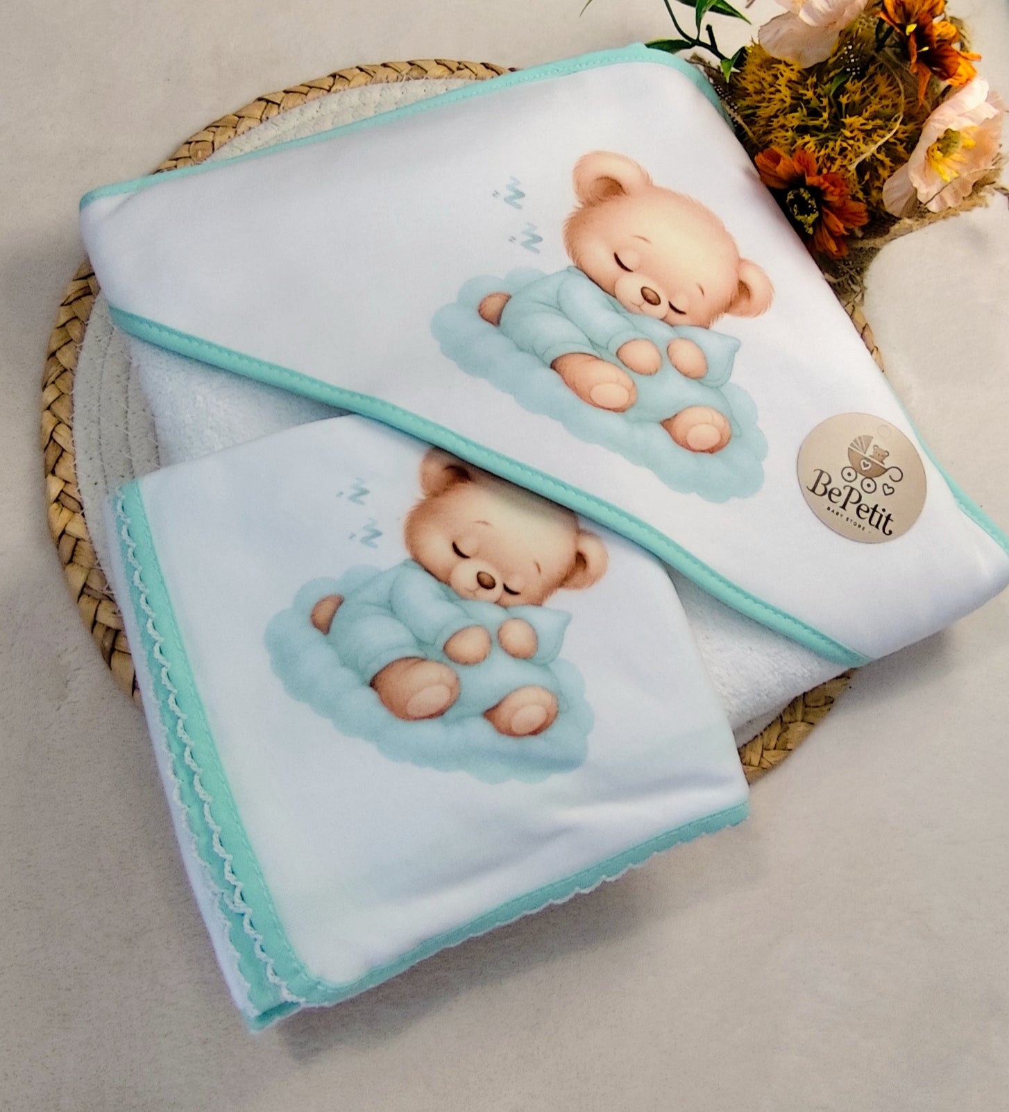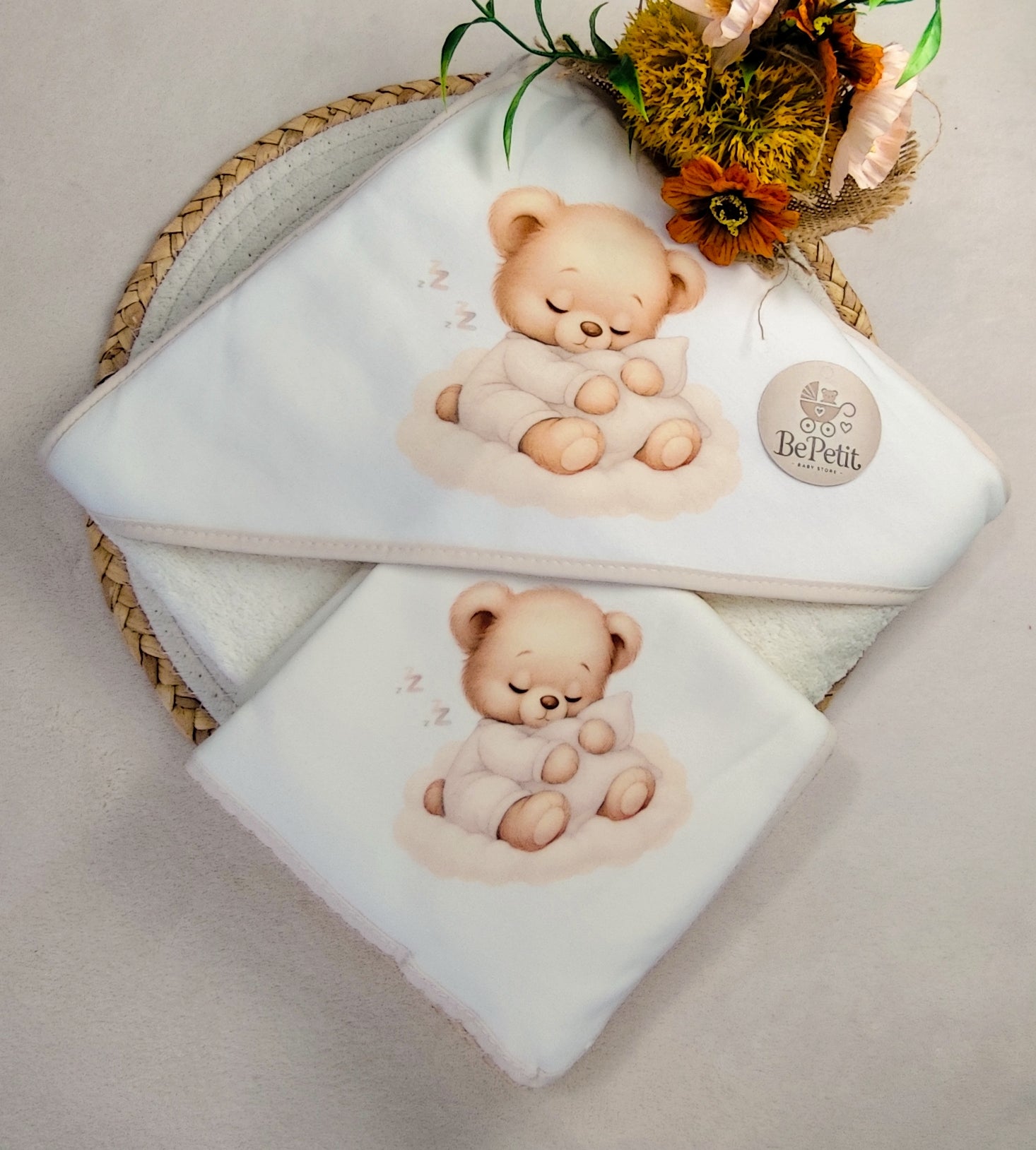 1 Toalha (0,80 x 0,80 cm) – ideal para envolver o bebé após o banho, garantindo aconchego e secagem delicada.