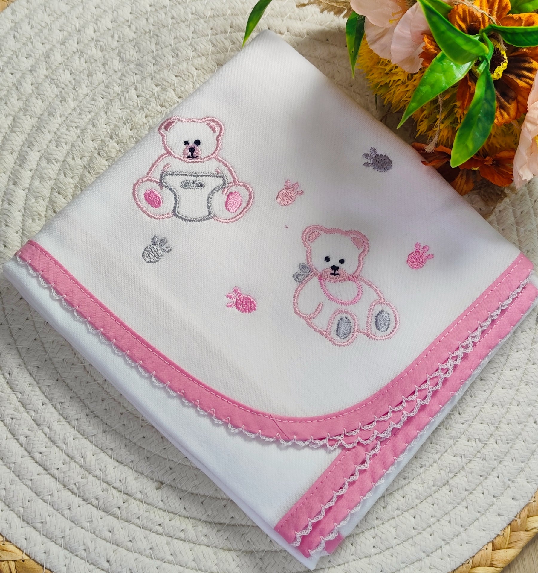 Fralda em 100% algodão com bordados é perfeito para os primeiros momentos do seu bebé. Conforto, charme e um toque especial para o dia-a-dia.
