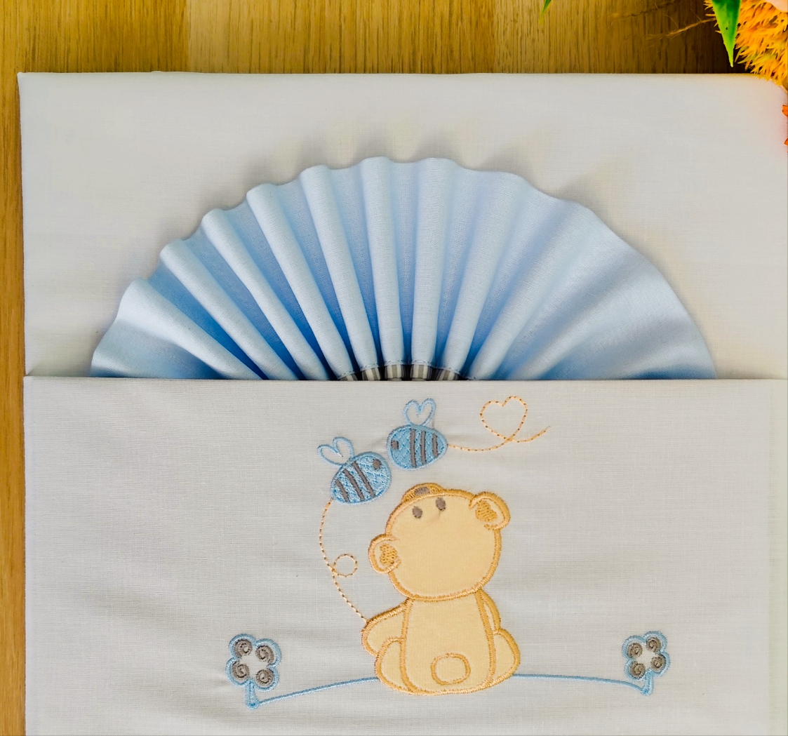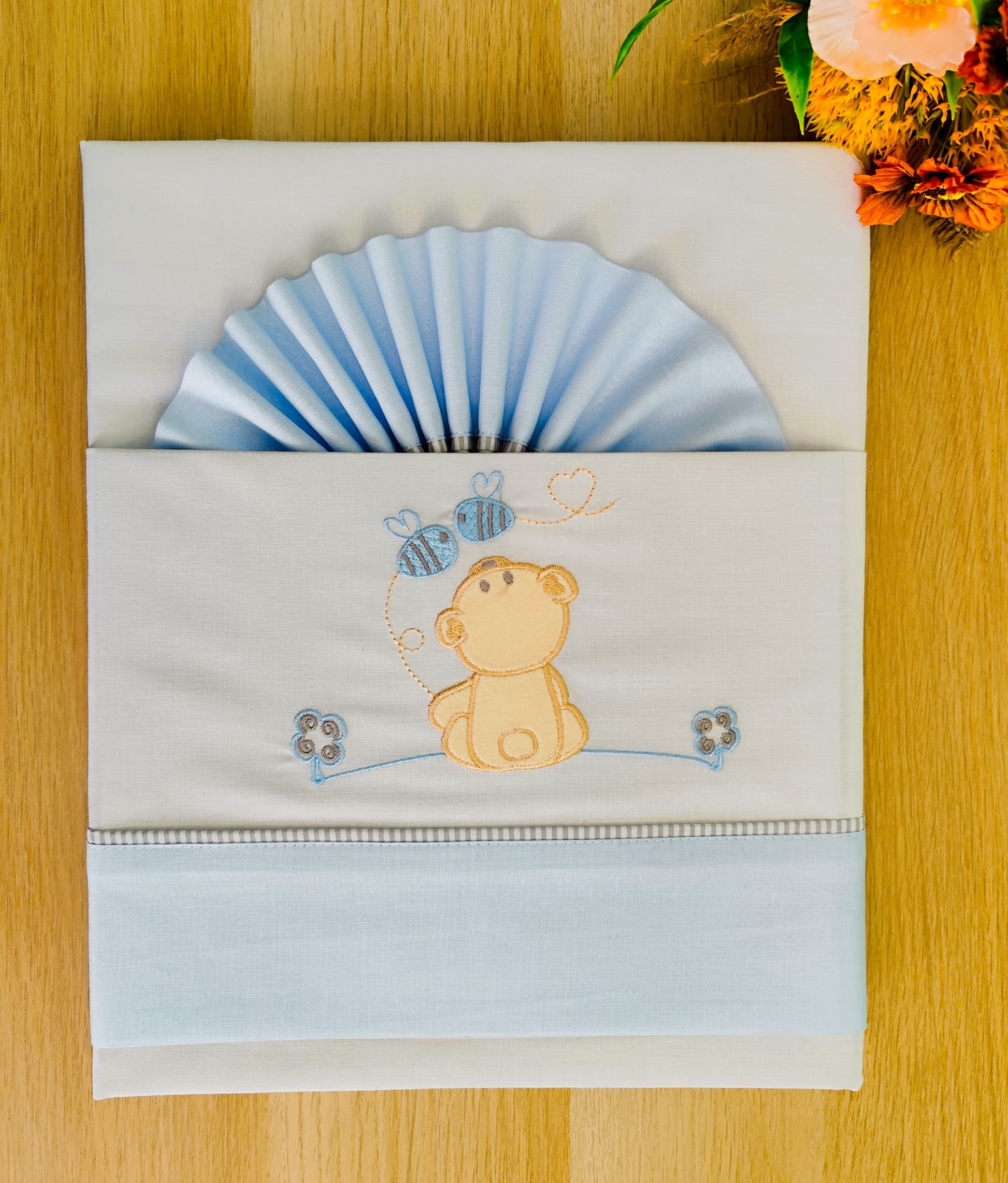 Jogo cama bebé em 100% Algodão  com 3 peças fundo branco.