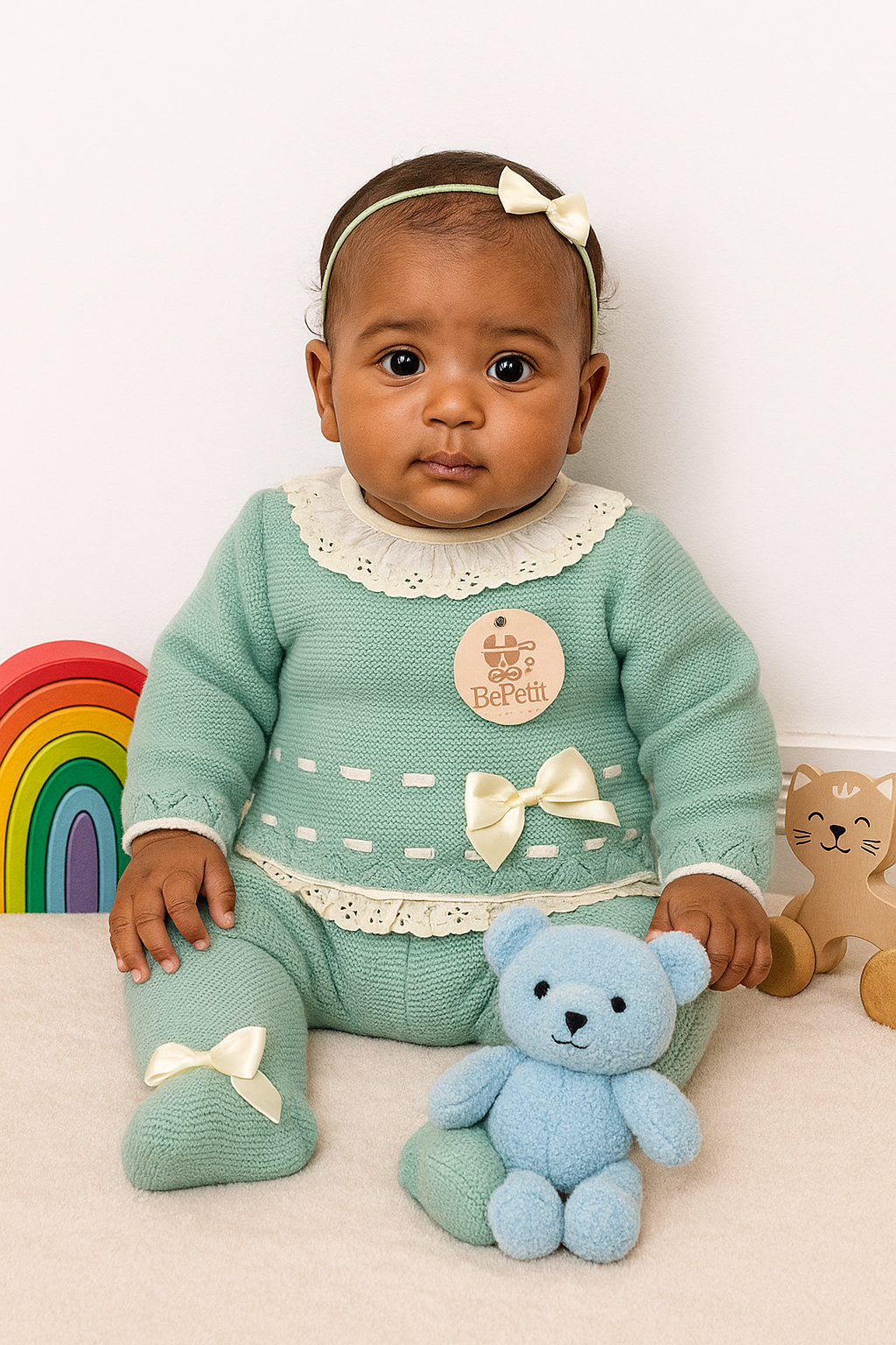 O conjunto perfeito para o seu bebé: três peças em malha suave com laços delicados, ideais para conforto e estilo nos primeiros meses. Cores suaves e design encantador para momentos especiais