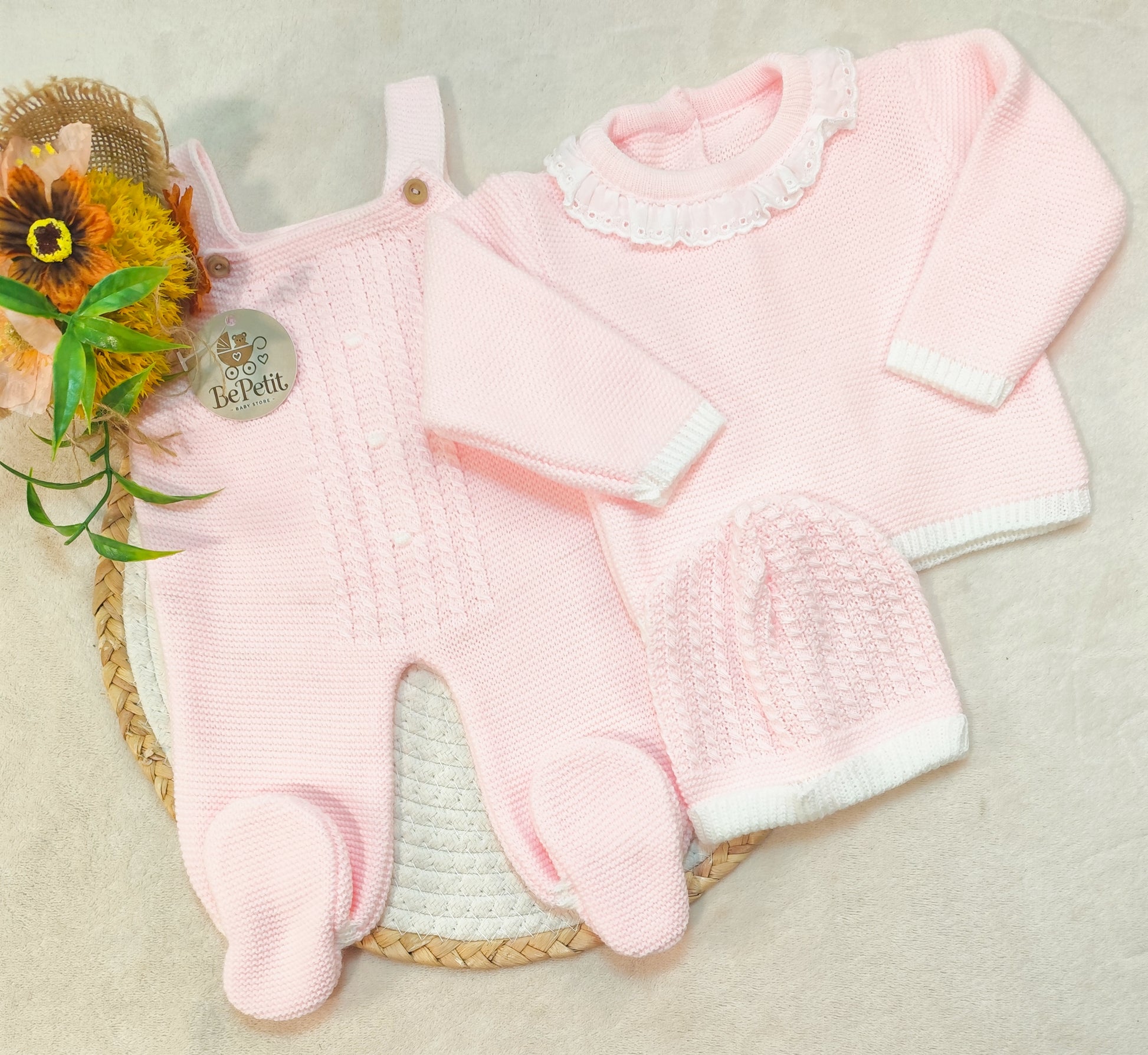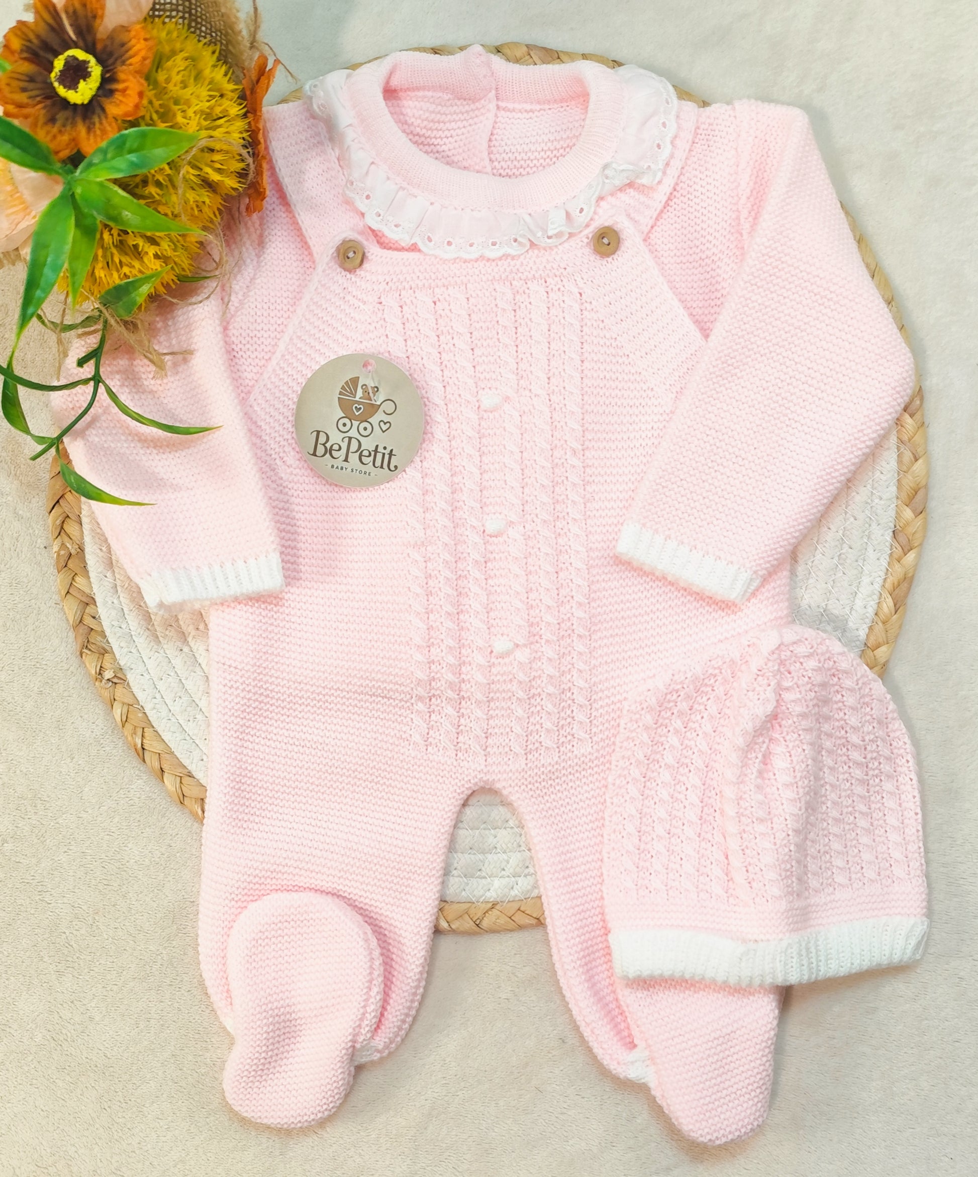 Perfeito para os primeiros meses do seu bebé: conjunto de jardineira, body e chapéu em malha suave, ideal para conforto e estilo. Disponível em rosa bebé, tamanho 1-3 meses