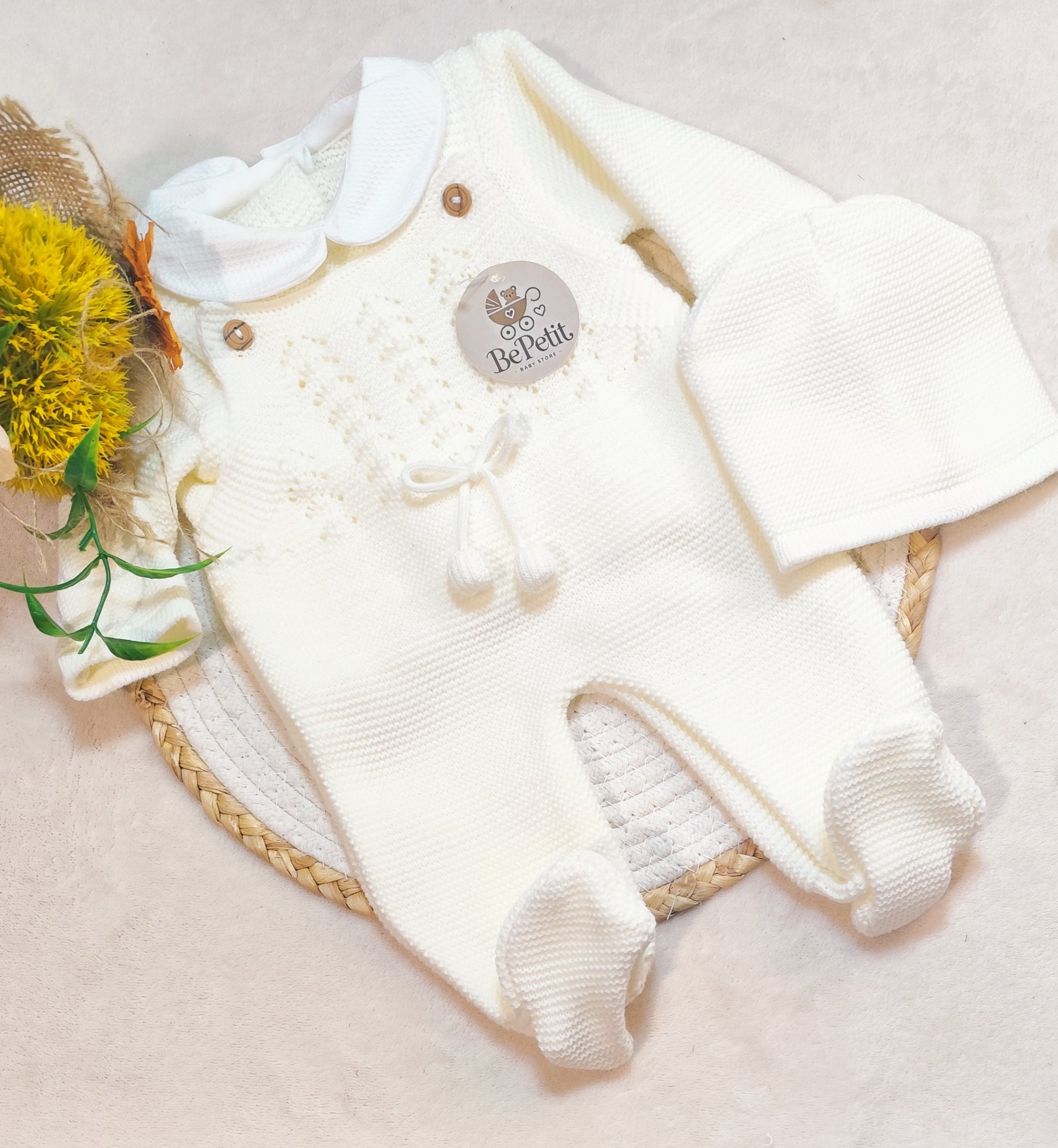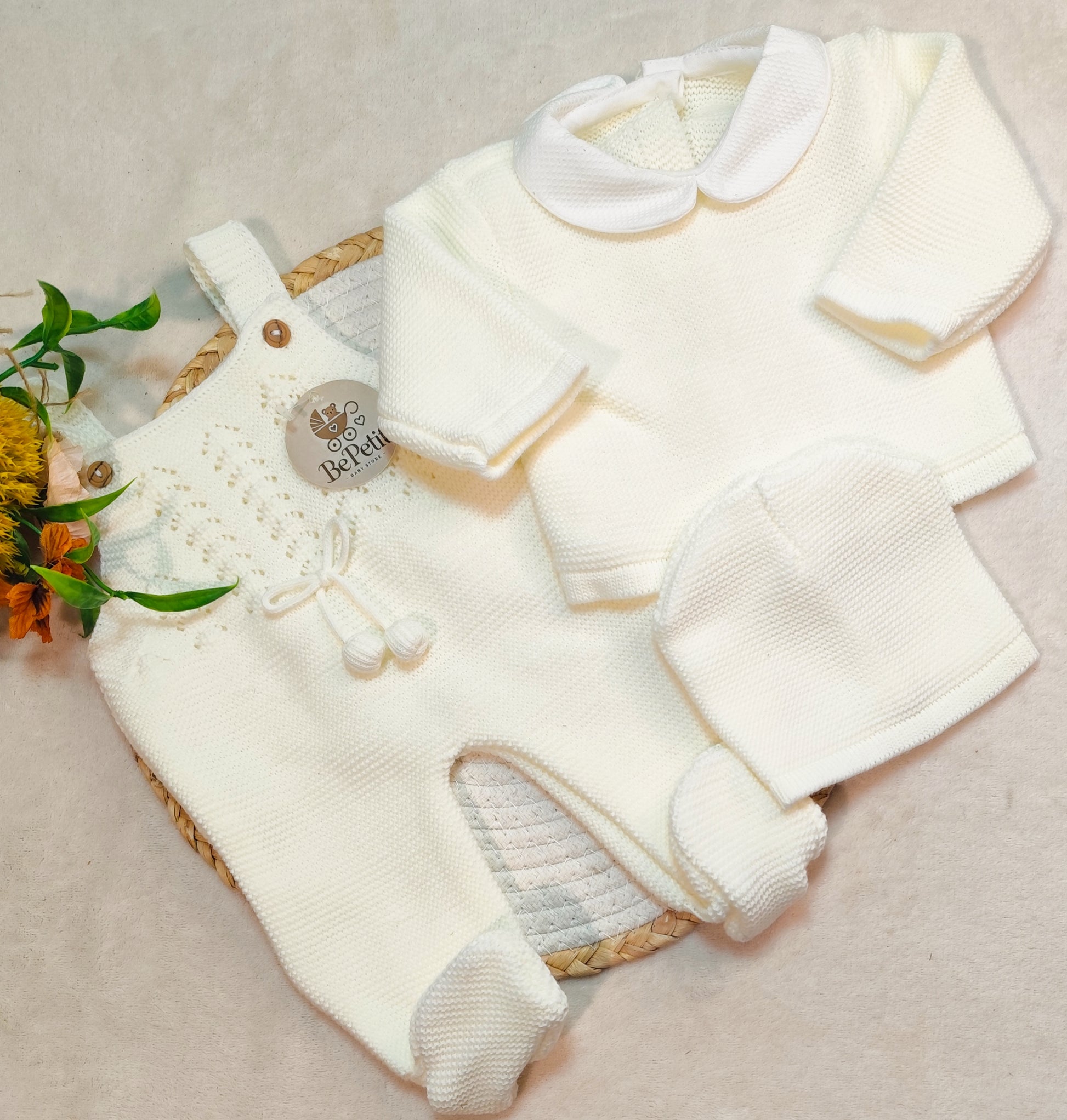 O conjunto perfeito para o seu bebé: três peças em malha suave, ideais para conforto e estilo desde os primeiros meses. Cores delicadas e design encantador para momentos especiais.